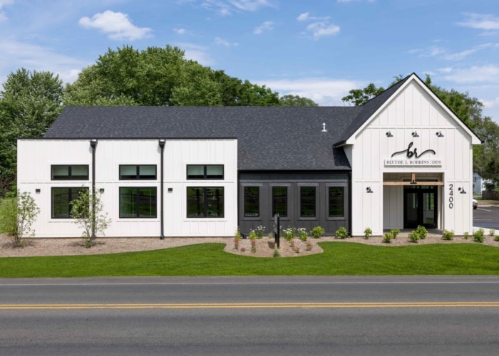 Progress Studio Architecture and Interior Design designed the Blythe Robbins DDS Clinic in Connersville, Indiana, blending modern farmhouse aesthetics with a welcoming interior to create a calm, efficient dental practice.