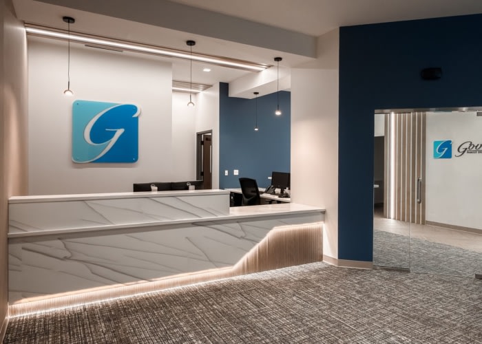 Progress Studio Architecture and Interior Design transformed a former insurance facility into Gove Family Dentistry in Fishers, Indiana, creating a modern, efficient, and welcoming dental environment tailored for patient comfort.