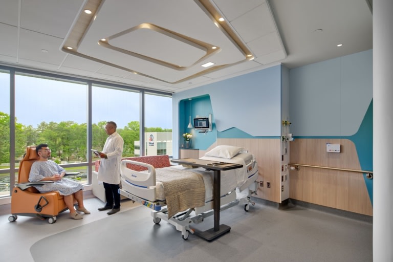 Deborah Heart & Lung Center - Olsen Family Patient Care Pavilion View Project EwingCole Halkin | Mason Photography Lasata Recliner by Carolina Overbed Table, Patient Recliner, Patient Room, patient-bed, People