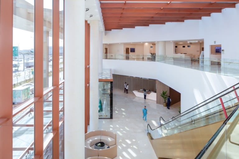 King's College Hospital London, Jeddah View Project HKS Luke Hayes Column, Plants, Reception Area, Stairs, Wall-Mounted Display