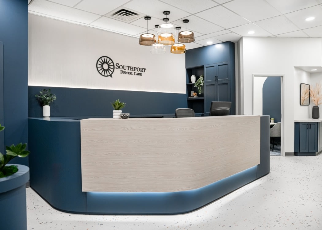 Block Interior Design was engaged to refresh key public and staff-facing areas of the clinic, including the waiting area, reception desk, client circulation zones, and administrative offices. Rather than pursuing a full interior overhaul, the design strategy focused on targeted, thoughtful updates that would modernize the space while integrating existing architectural elements. Rather than removing or replacing these features, they were carefully incorporated into the updated design to ensure a seamless transition between old and new. This sustainable approach allowed Southport Dental Care to elevate the patient experience while minimizing disruption to daily operations and maintaining continuity of care throughout the renovation process.
