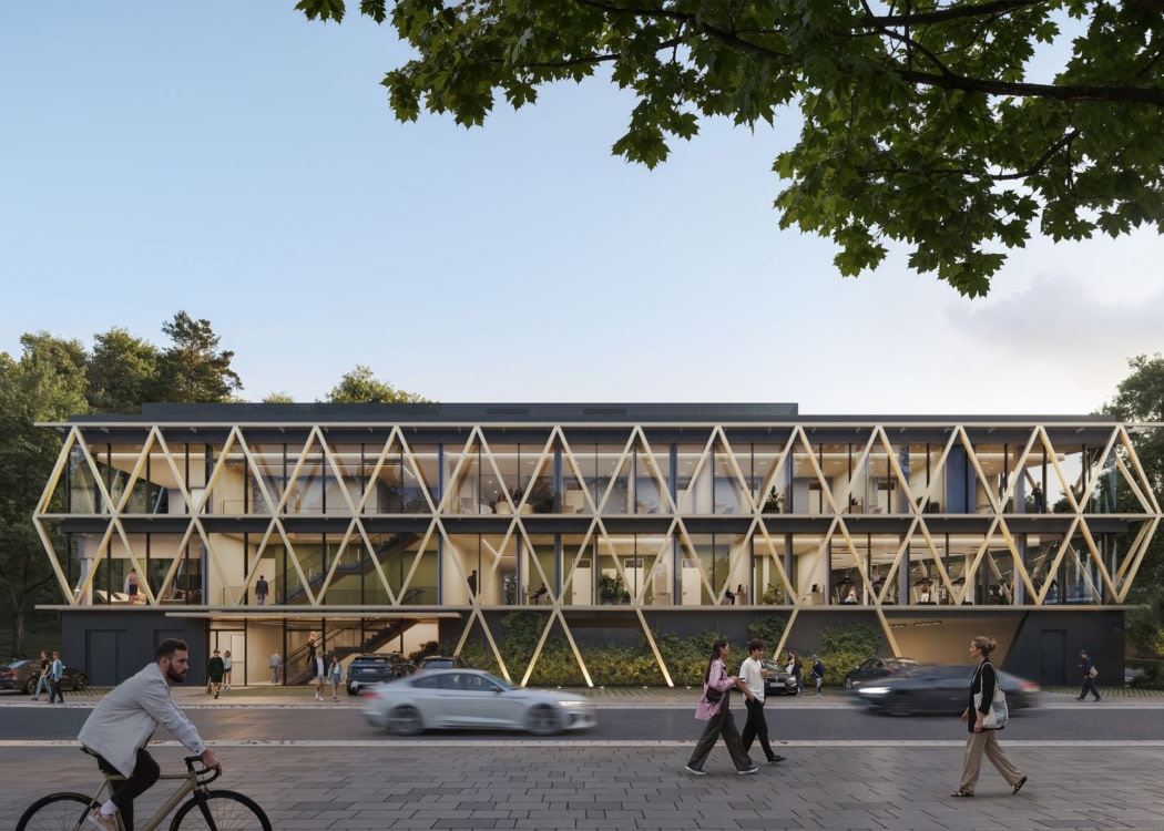 The new building was realized as a reinforced concrete skeleton structure with concrete cores, columns, and walls. The applied metal façade draws formal inspiration from the historic graduation tower of bad orb, reinterpreting its timber framework structure in a contemporary way.