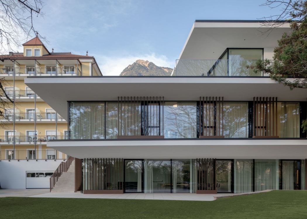 Monovolume architecture + design’s ParkClinic Martinsbrunn in Merano seamlessly integrates specialized healthcare within a serene, nature-inspired environment, featuring a distinctive floating facade that enhances patient comfort and psychological well-being.